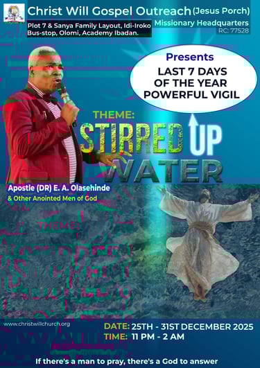 Venue: - Christ will gospel outreach, Plot 7 & 8, Sanya Family Layout, Agric Area, off Olojuoro Road, Idi-iroko Bus-stop, Olomi/Olunde Road, Academy Ibadan, Oyo State, Nigeria.